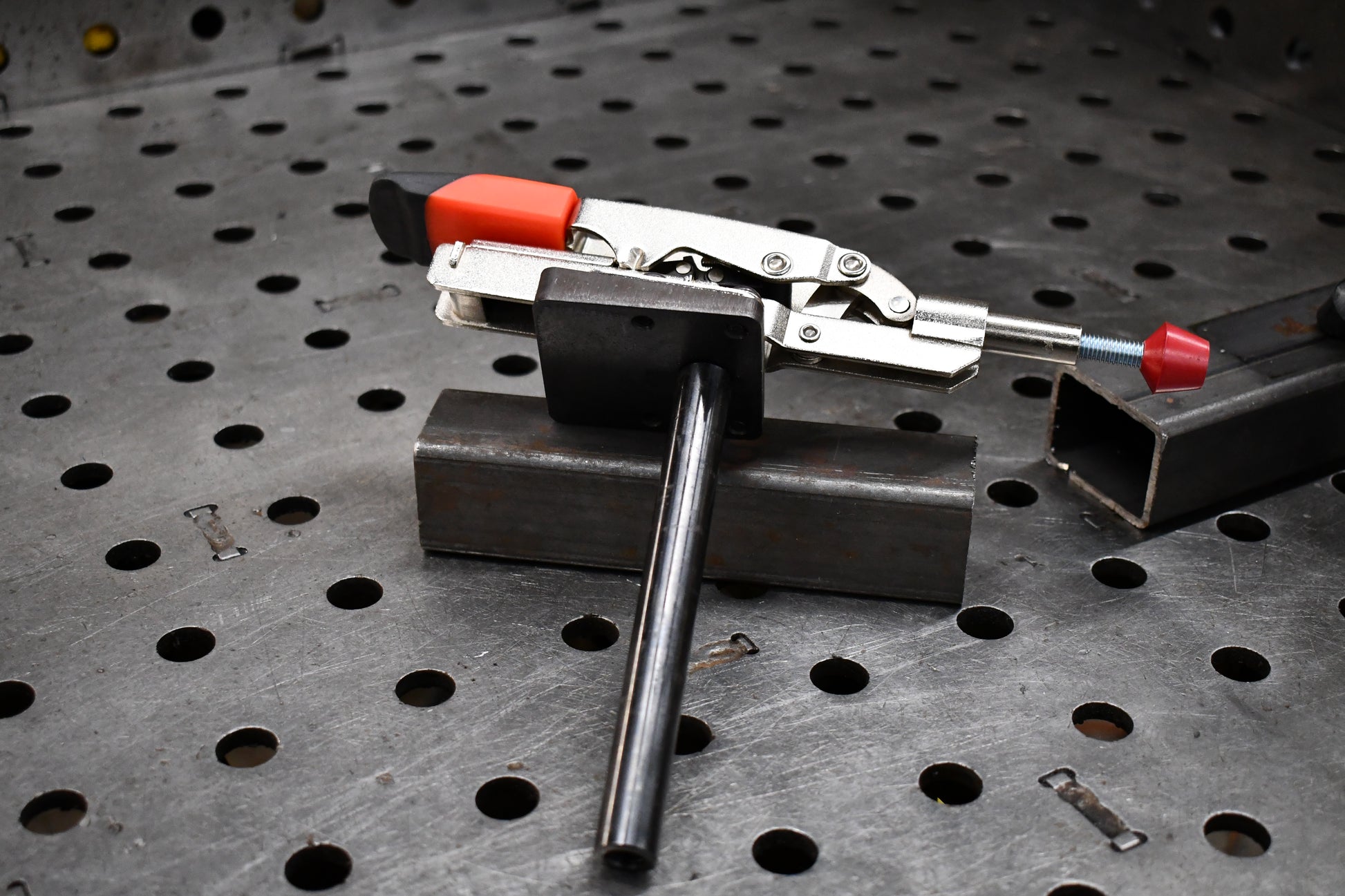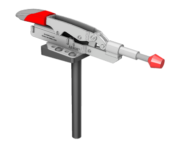 This auto-adjusting push style toggle clamp features a rubber contact point and a 5-3/4 inch tall stand to reach taller assemblies on your BuildPro table. The stand can be inserted to any depth, provided there is enough frame clearance under that hole in the table. See our clamps equipped with short stands for limited clearance applications.